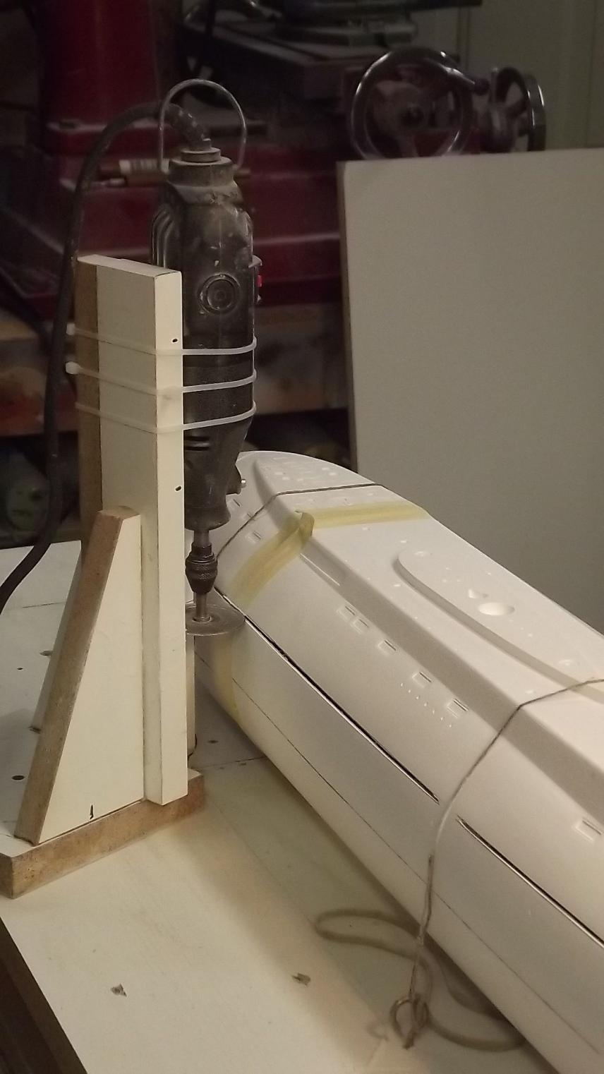The twine straps are glued at the top of the hull to keep things from rotating out of alignment as I press against the work with my man-eating moto-tool death-machine.