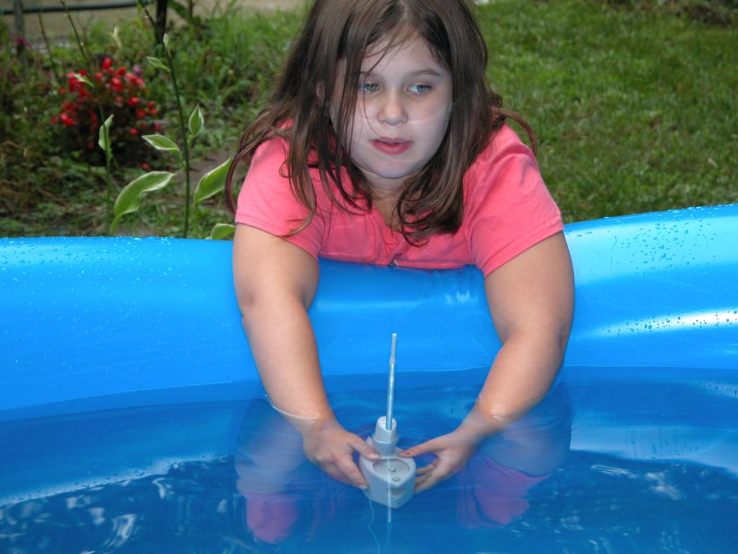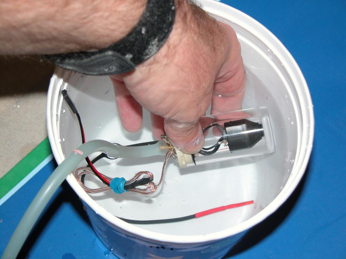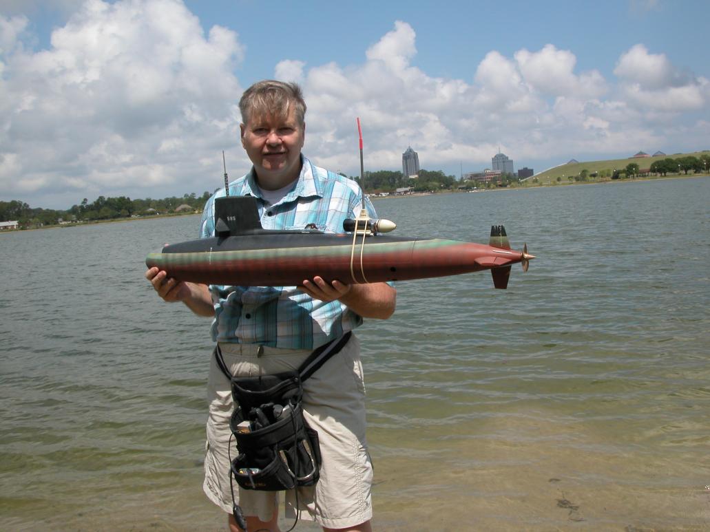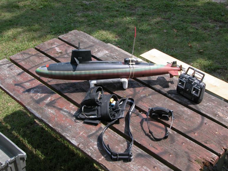 Below are some shots of the system married to a 1/72 SKIPJACK r/c submarine. As you can see, the camera-transmitter is simply strapped atop the model -- as long as its antenna is above water (which it is as long as the model remains at or above periscope depth -- you can see all the action through the virtual goggles, no sweat.