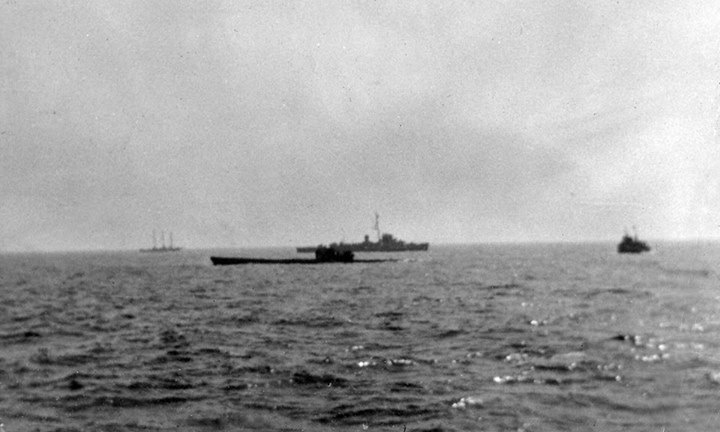 On the white photo border, he wrote U-Boat captured on the ocean. But, this looks like a late model U-boat to me. I'm having trouble figuring out how my Uncle could have this photo with that date on the back. I've checked the records and the early captures were of VIICs. This one looks like a IX, with the wintergarden gun deck on the rear.