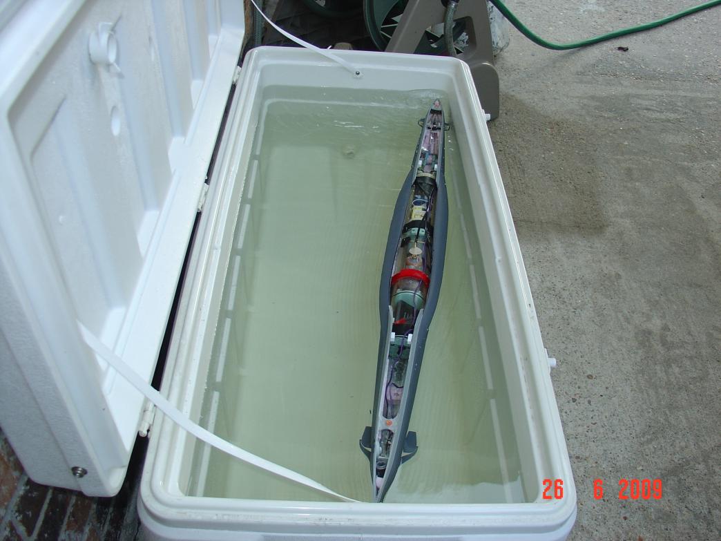 I ran my new screw couplers this morning in my pool (cooler). The couplers work really well. I'm beside myself with amazement. How simple. At higher motor speeds I do get a little vibration. If you notice in the picture you can see ripples beside the hull (vibration). Me thinks (David) that if I make the 1/8 brass rod inside the fuel line a little longer to reach almost to the motor shafts I think the vibration will go away. Or at lease lessen.