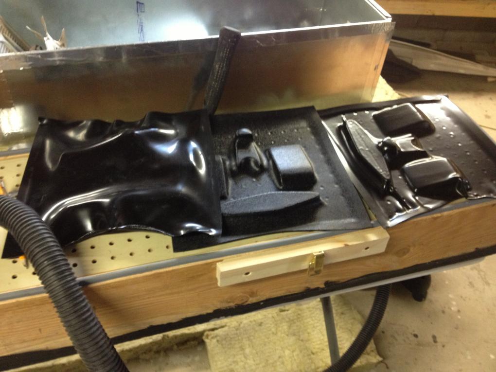 After about 5 minutes, the plastic was pretty soggy, so, with the vacuum on, I pulled the frame over to the vacuum chamber.