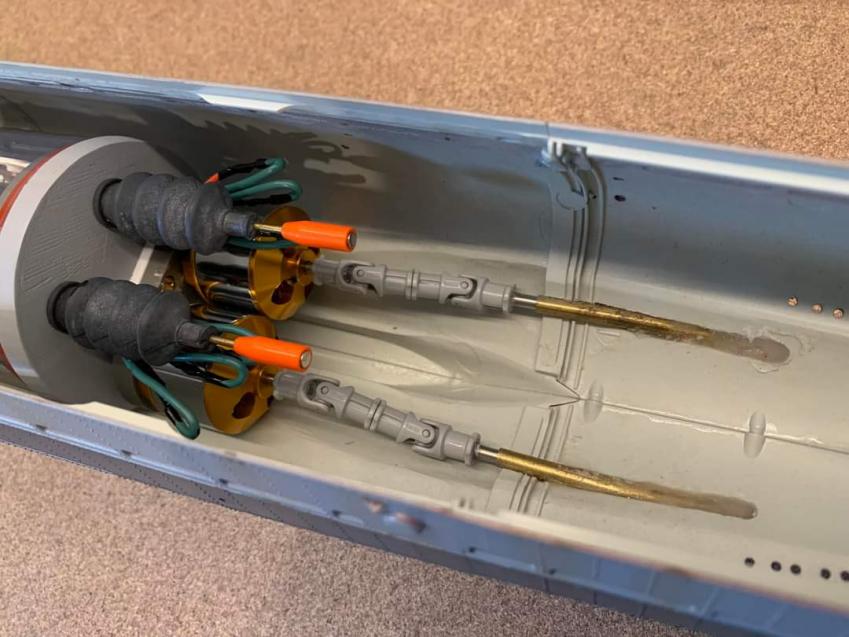 My shafts do not align. The motor shafts (5MM) are below and inside the Prop shafts (3MM). I can make longer Dog Bones and move the Cylinder forward of center, but looking for alternate ways to make the connections. Disregard the center shaft with the notch in the photo. Thanks for ideas.