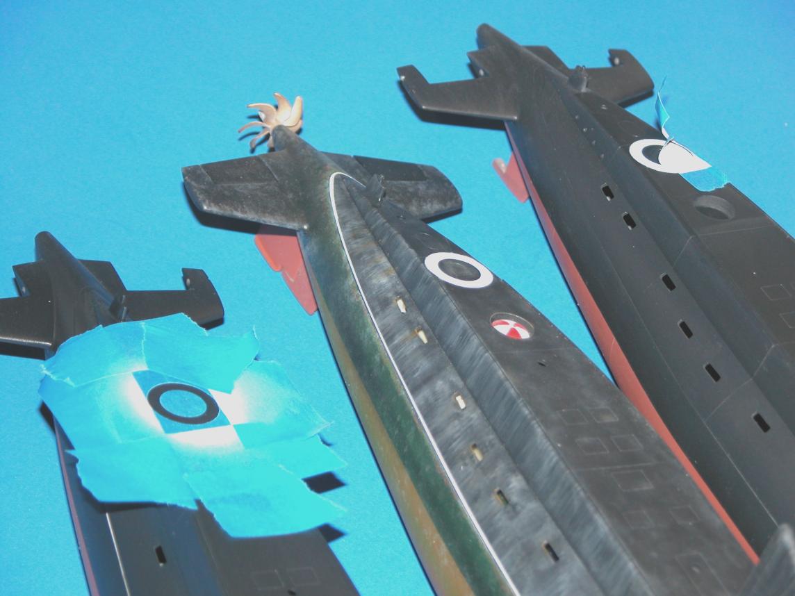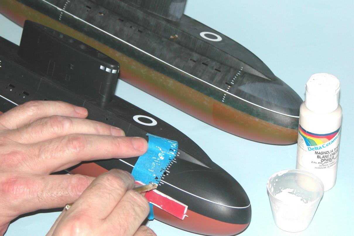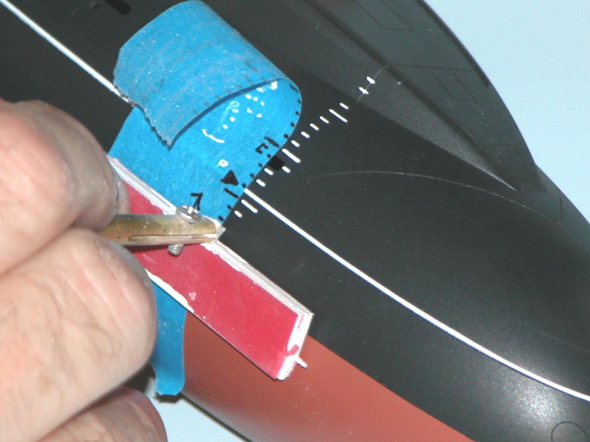 Note the varied use of the low-tack masking tape: straight runs like the black-red demarcation lines on the hull; used as a position template for the bow-pen applied draft markings; and the circular masks on the after escape-trunk targets.