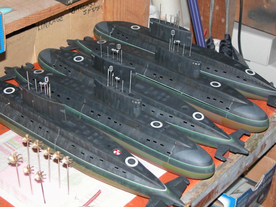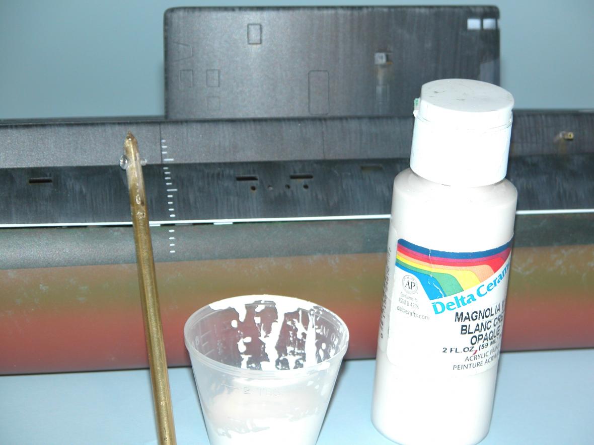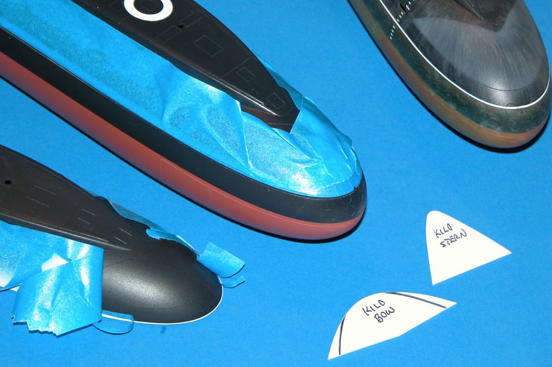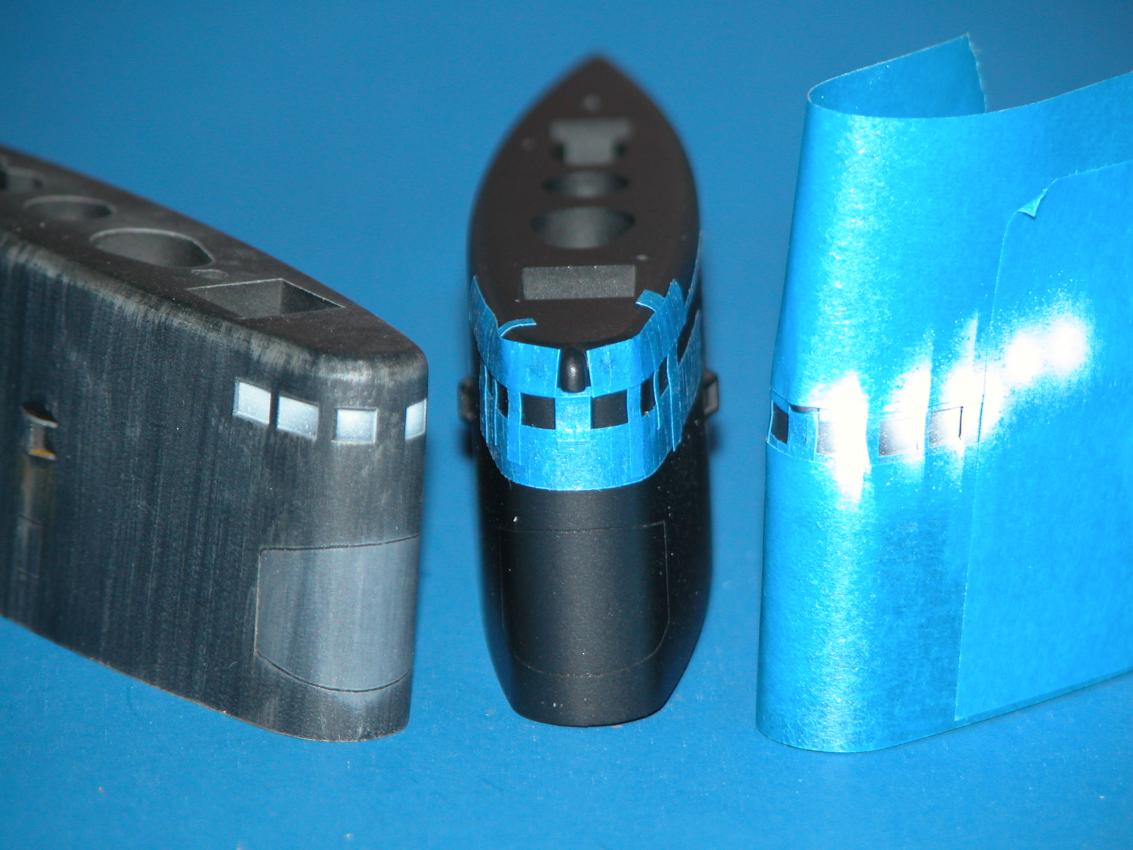 Note the varied use of the low-tack masking tape: straight runs like the black-red demarcation lines on the hull; used as a position template for the bow-pen applied draft markings; and the circular masks on the after escape-trunk targets.