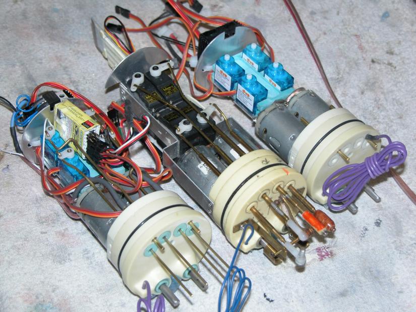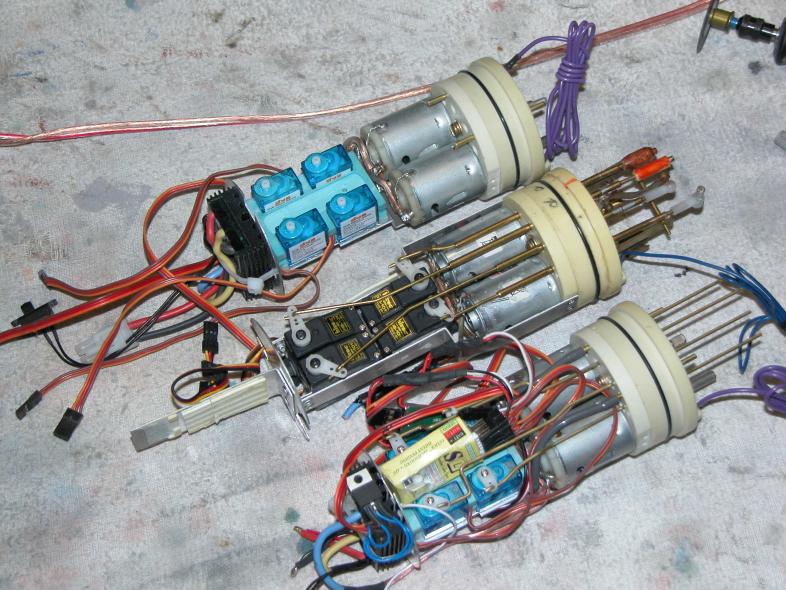 And I've just introduced a new scheme of fitting the servos to the SD, pictures below. This arrangement is now standard with any 2.5" SD employing the two motors. In the center is the 'old' way of mounting servos. The two outboard examples (one outfitted with devices, the other not) are of the new SD servo mounting scheme, now factory standard.