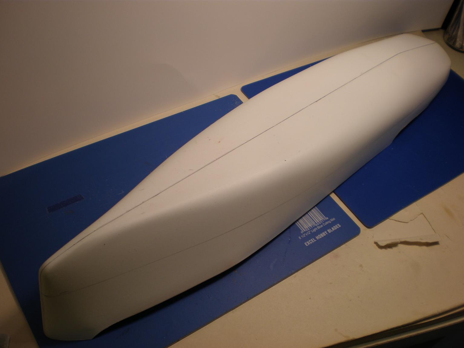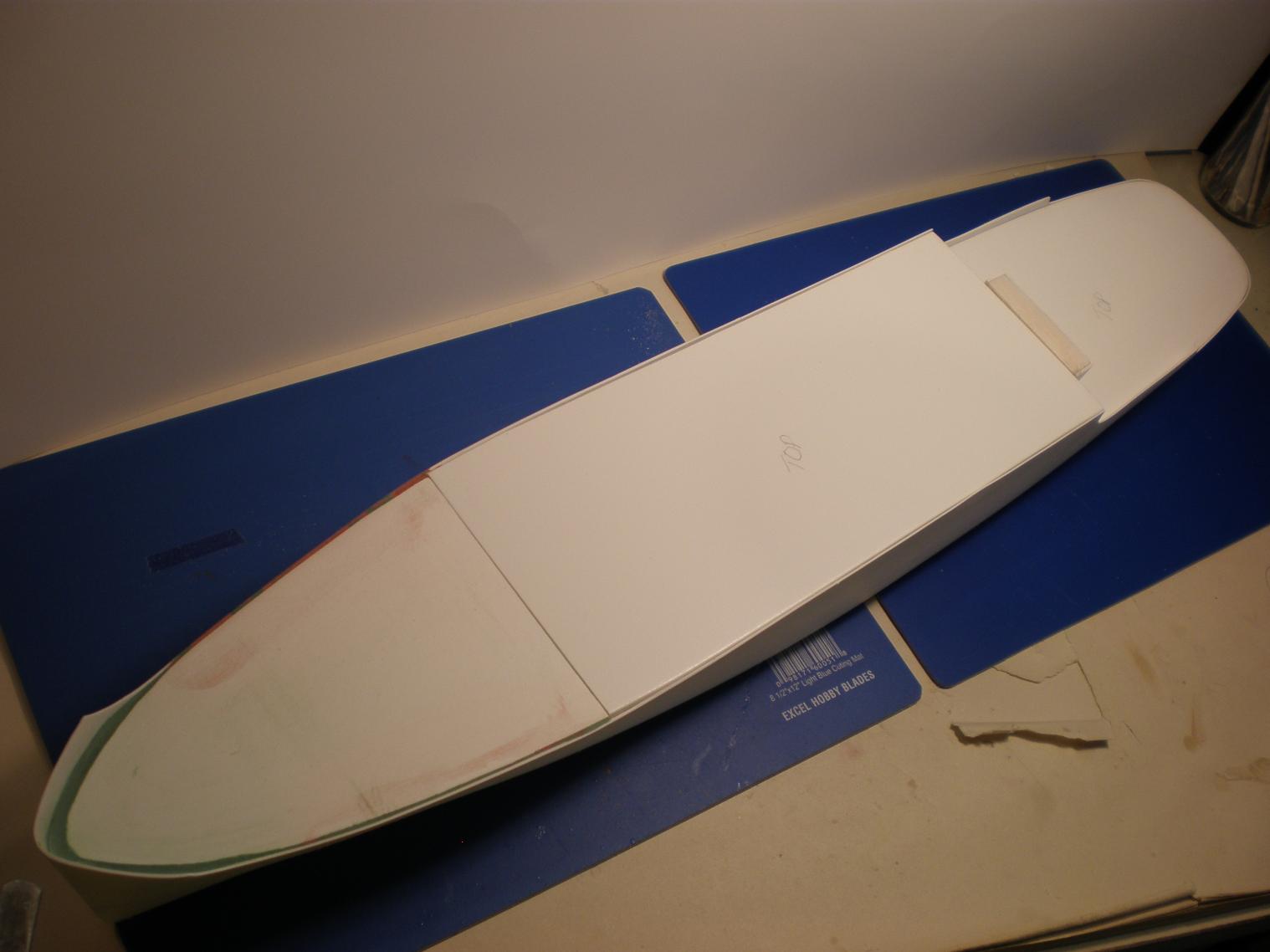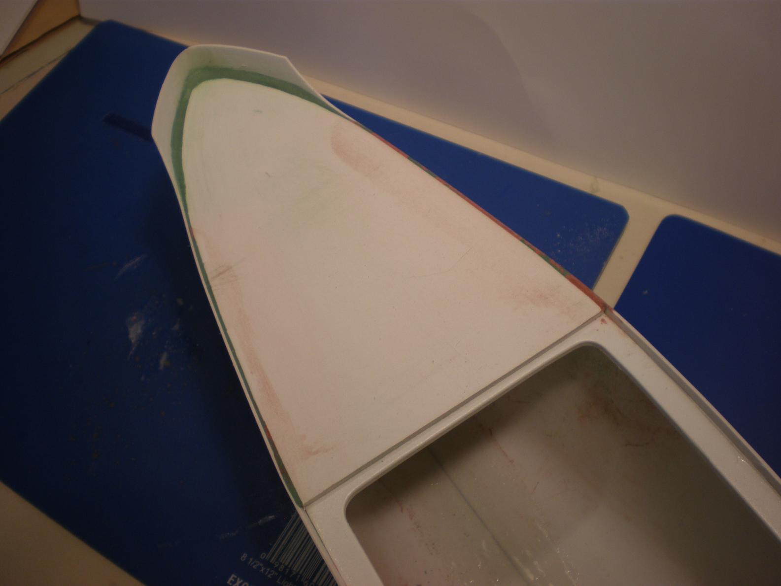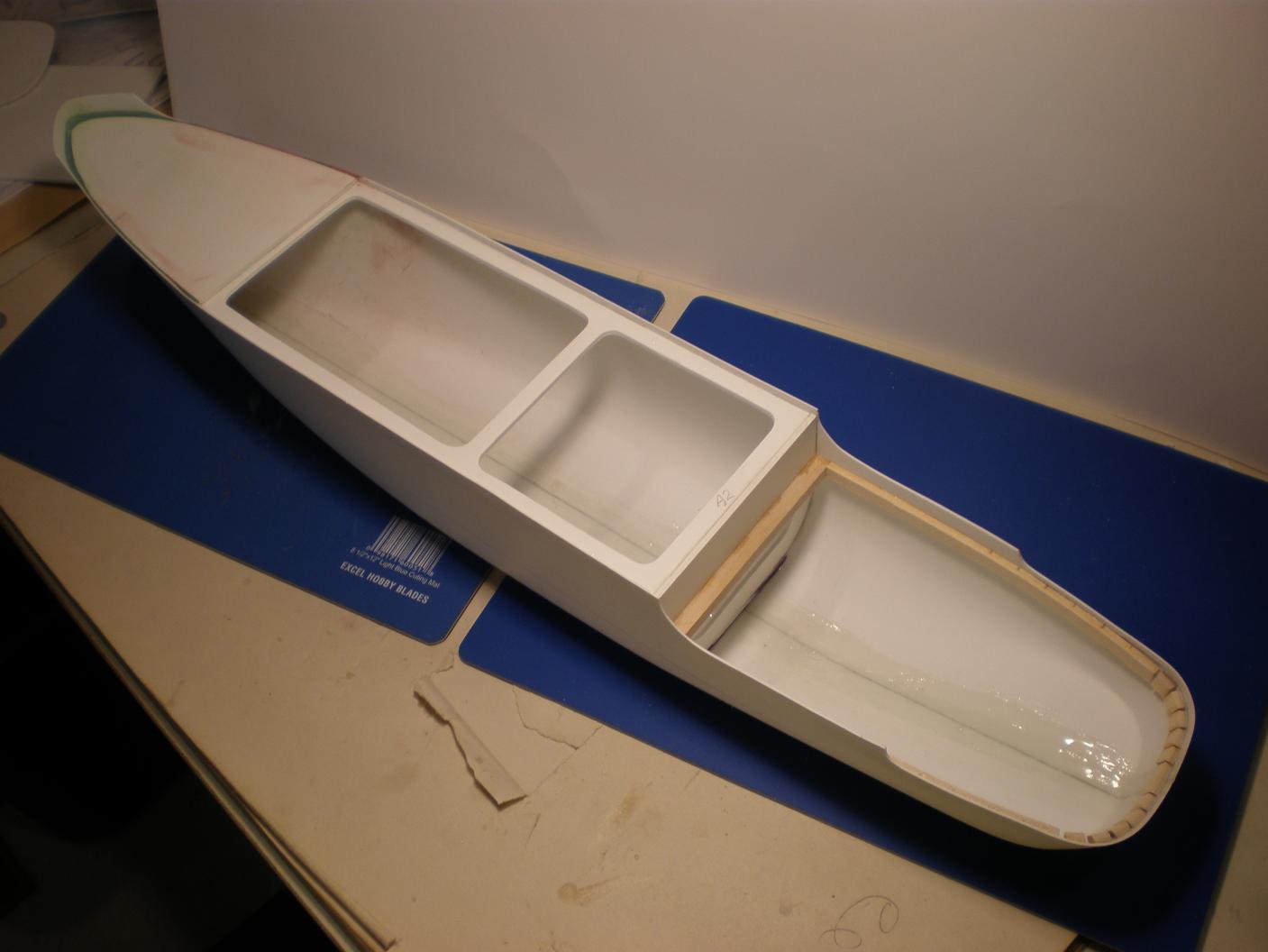 A little progress being made! Hull exterior has been trimmed of the assembly flange, and interior has been reinforced with the included fiberglass tape, and a coat of epoxy brushed over the seam: