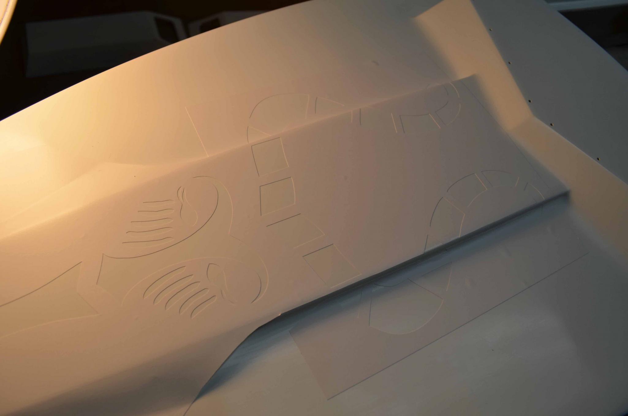 The graphics templates were done by Callie Graphics. We had many emails between us to get the graphics to my satisfaction. For this template, you peel the backside, adhere it to the model, press and press to be sure of the adhesion, then peel the front side, mask around the template, spray, then remove the masking and template.