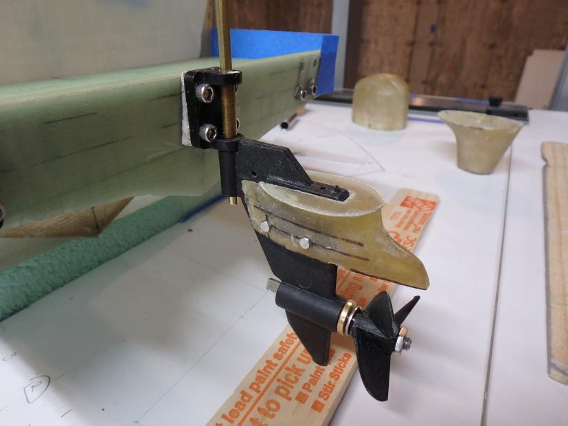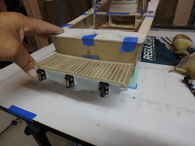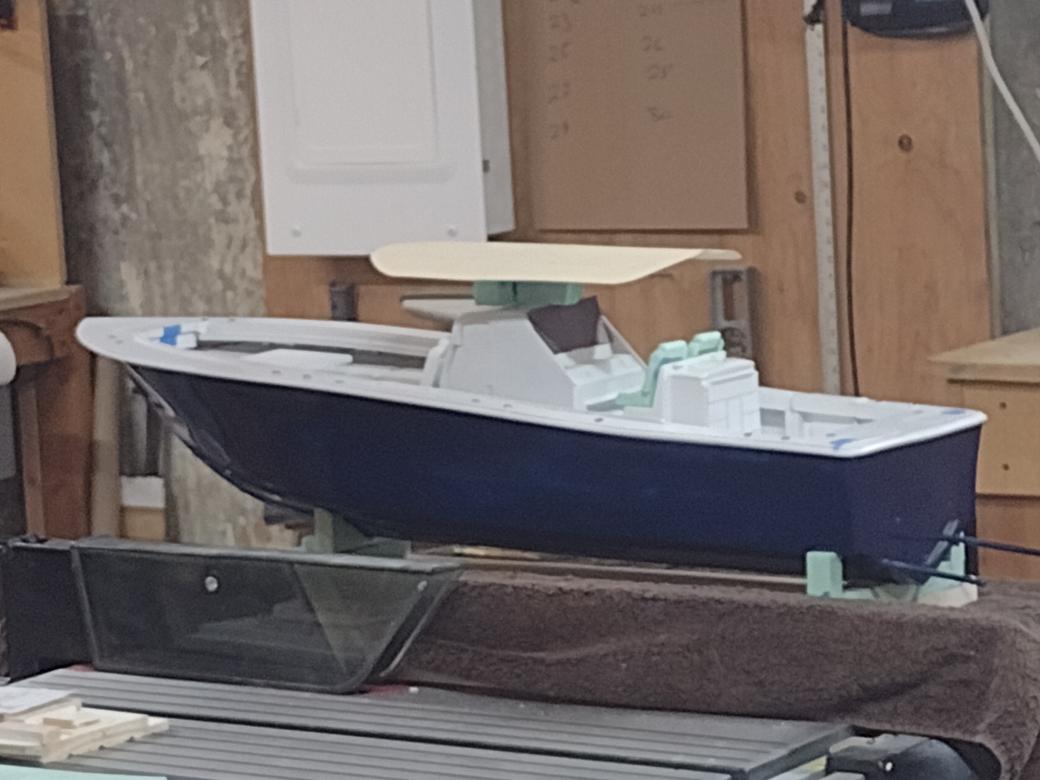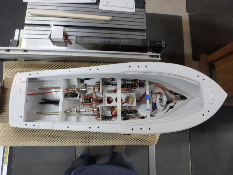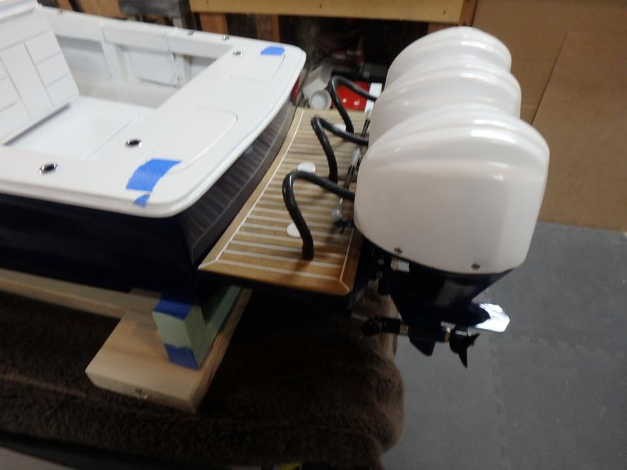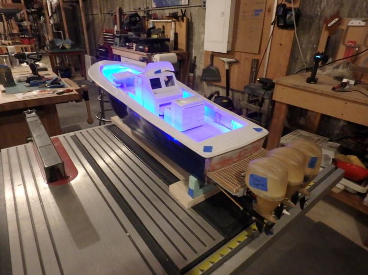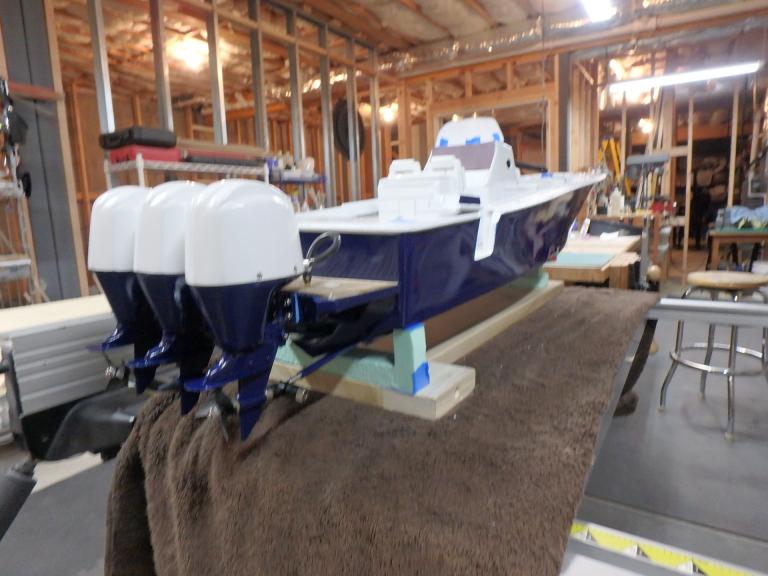 I started collecting documentation and drawing up the plans in 2019...She is built of fiberglass and Aspen plywood. Her power plants are to resemble three Yamaha F300 and are my own design utilizing modifies Krick Z-drives...shaft driven by two brushless motors. The center outboard is a dummy and initiates the steering via a Sullivan plastic cable ( connected below the waterline) then it imparts steering to the remaining port and starboard motors. I have floated the boat and tested the propulsion -the complete build can be found :