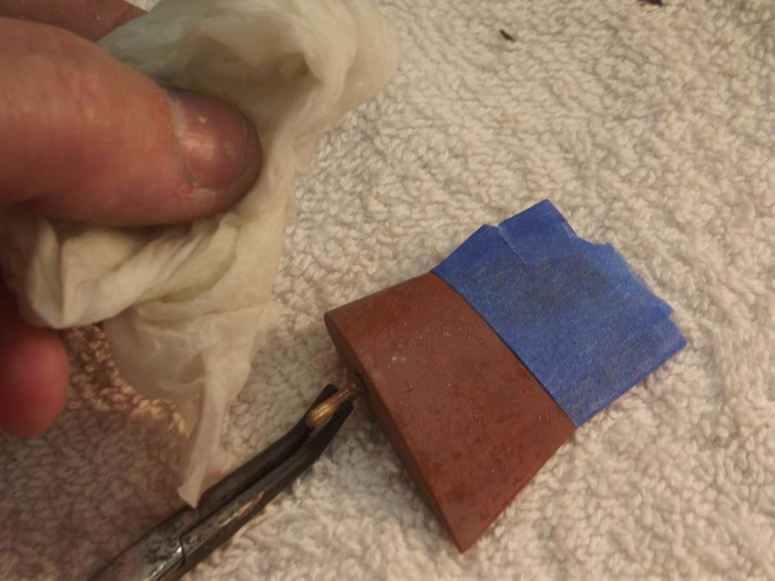 I take some tooth-past, cut it with water and, wa-la!, I got a brushable masking medium. The sugar based (water-soluble) mask is stippled onto the model surface, left to dry, then a mist of white is laid over the work. Once the white has dried, I wet the surface, the sugar vehicle of the mask melts, and the sticky goo is blotted off the model leaving the mottled look I'm after.